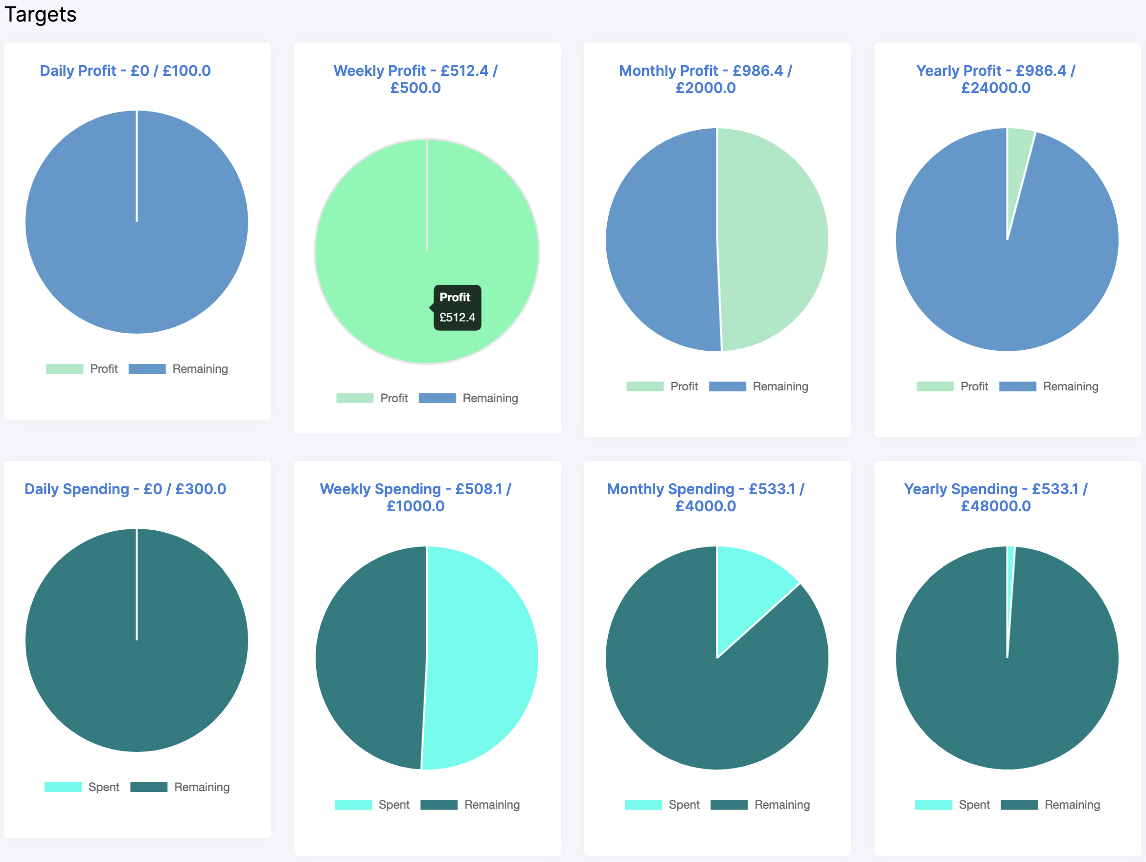 Create and track daily, weekly, monthly and yearly spend and profit targets and see your progress in real time.